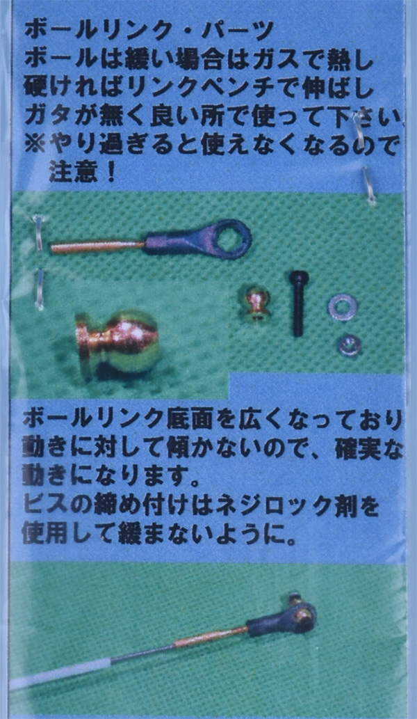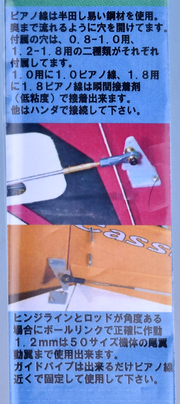 0.8mmのピアノ線(650mm)、ボールリンク、テフロンABS樹脂パイプ(600mm)が2個ずつセットになっています。ロッドエンドとピアノ線は半田付けで固定してください。
